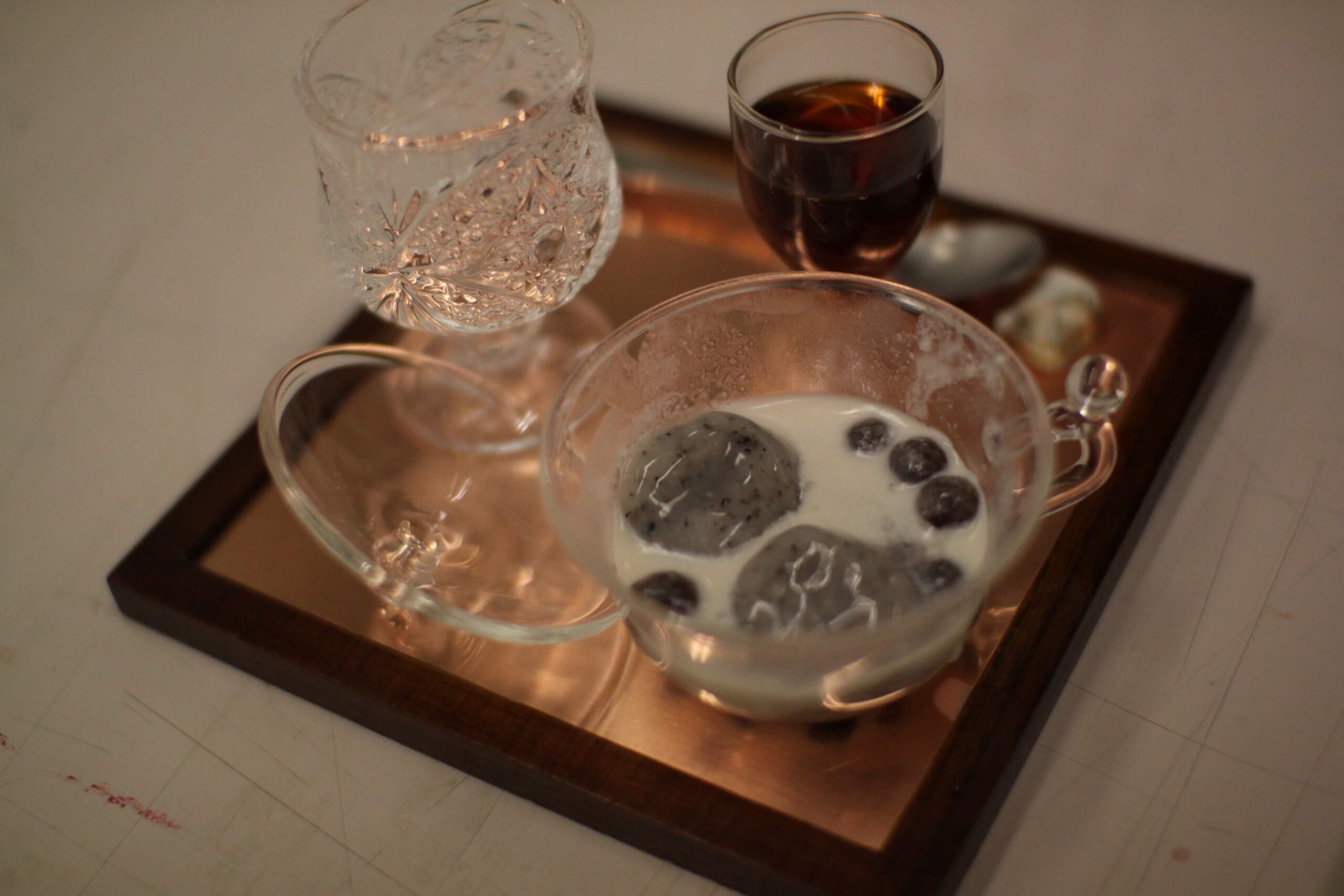 Material:パフォーマンス、黒胡麻白玉入りタピオカココナッツミルク、中国茶、レモン、干し肉、ドライフルーツ、銅板、紙、インク