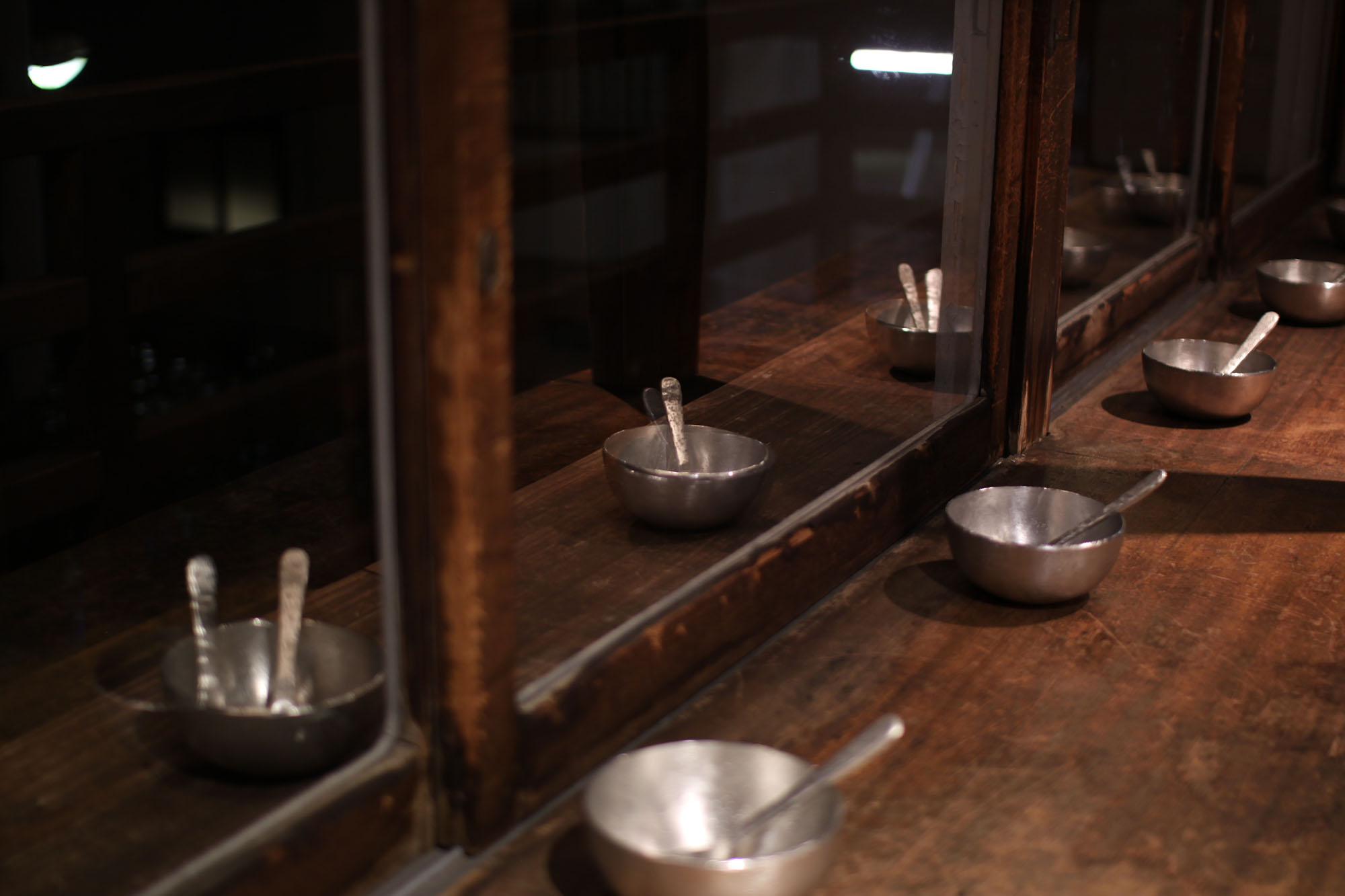 このボウルとスプーンは14セットあり、窓を挟んで室内と屋外に7セットずつ並べられた。